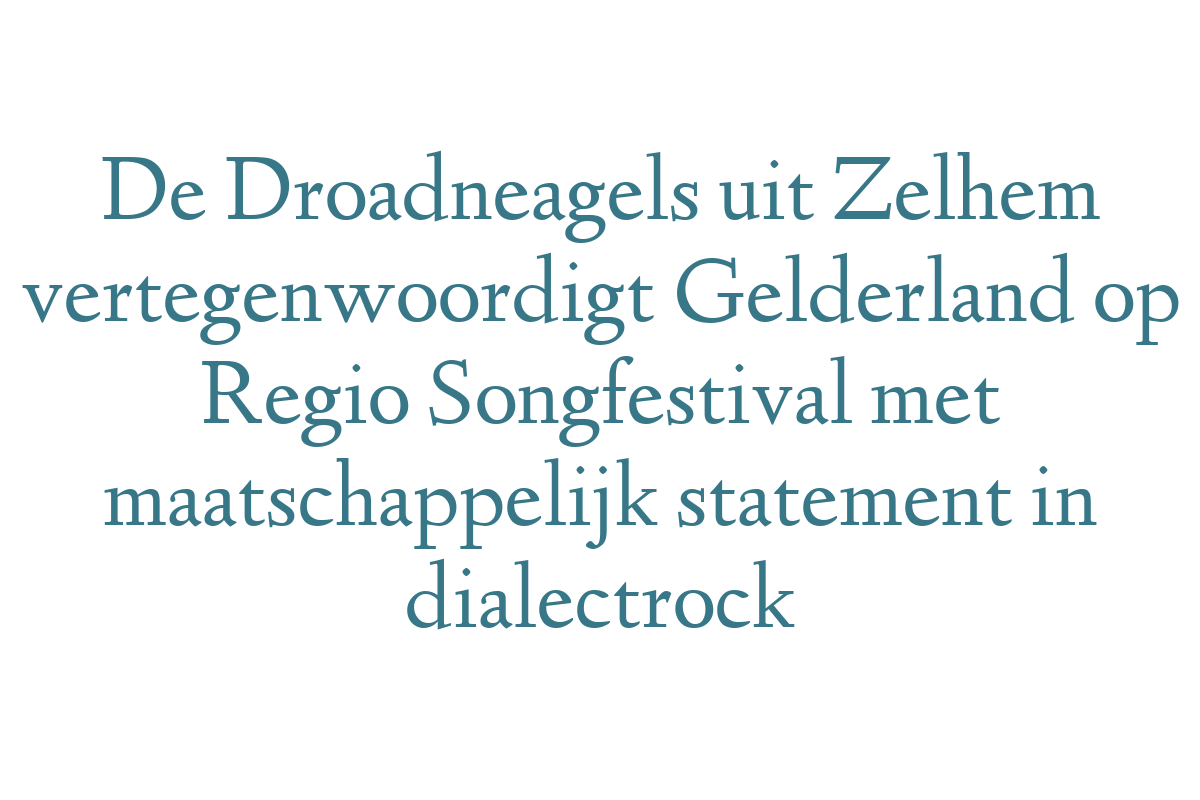 Zelhem - Streekgids Het laatste nieuws - - Het laatste nieuws uit de Achterhoek ZELHEM/ARNHEM - De Achterhoekse dialectrockband De Droadneagels zal op zaterdag 1 november 2025 de provincie... De Droadneagels uit Zelhem vertegenwoordigt Gelderland op Regio Songfestival met maatschappelijk statement in dialectrock...
